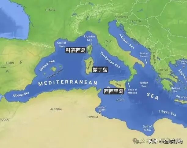 它被亚欧大陆和非洲大陆包围,海域边界线就是大陆海岸线,海域内则分布着大量的岛屿,其中有一些面积相当大,比如地中海第一大岛屿西西里岛,面积达到2.57万平方公里,撒丁岛面积也超过2万平方公里,达到2.4万平方公里;