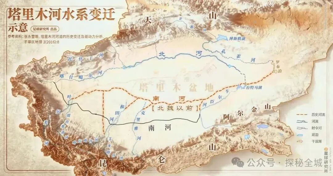 在今天,大多数人都知道塔克拉玛干沙漠在不断南移,但实际上,塔里木河历史上也在不断北移,人们在塔克拉玛干沙漠中部以及南部区域,都发现了疑似塔里木河古河道的遗迹;