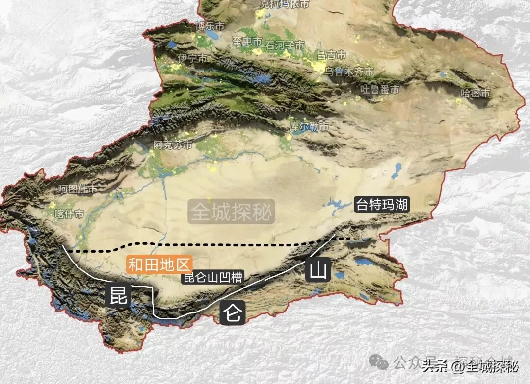 从地理位置上看,和田地区位于新疆最南端,昆仑山以北,巍峨雄浑的昆仑山峰峦重叠,山势险峻,海拔最高超过7000米,跟塔里木盆地形成了4000-5000米的巨大落差;