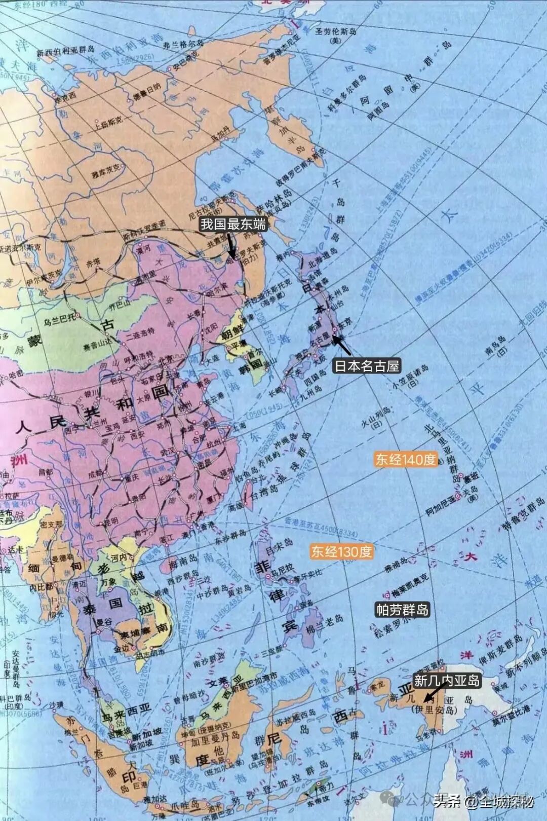 而我国最东端黑龙江与乌苏里江交汇处,位于东经135度附近,跟日本的名古屋、太平洋岛国帕劳群岛以及大洋洲的新几内亚岛经度差不多;