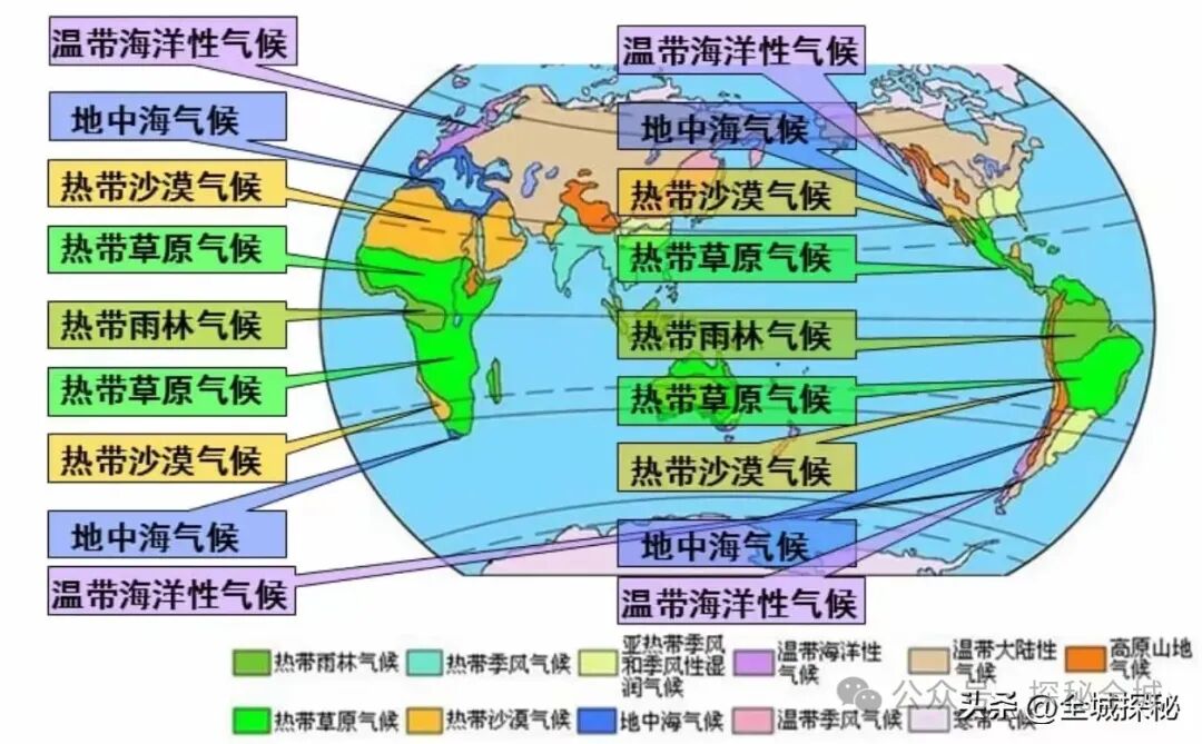 另外,在不考虑地形条件、海陆条件以及洋流等因素的情况下,纬线也能体现出气候的变化,越靠近0度纬线也就是赤道,气候越炎热,越靠近南北纬90度也就是南极点和北极点,气候越寒冷,等等;