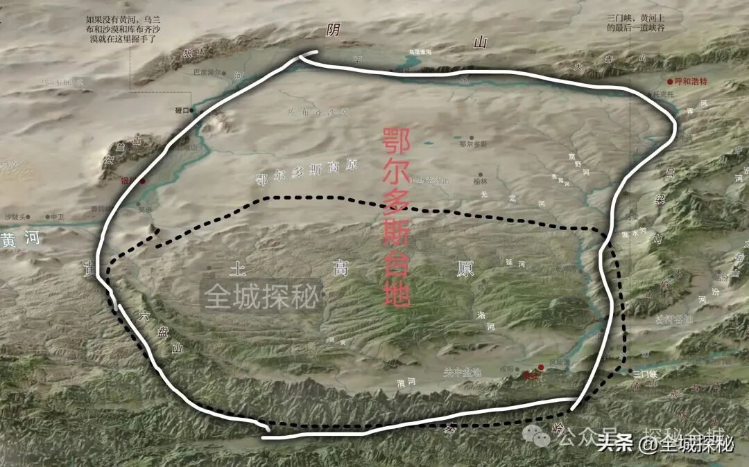 但在地形图上,我们仍然能辨别出黄土原湖湖床的部分轮廓,如果去掉黄土高原上数百万年堆积的厚厚黄土层,那么鄂尔多斯地台将会真正暴露,我们也能更加清晰地看到昔日的黄土原湖湖床。