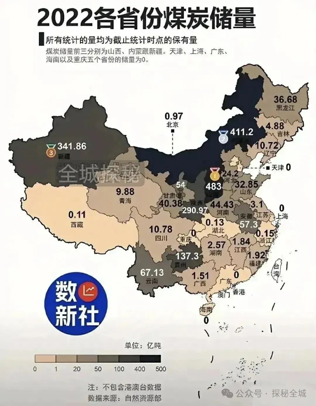 山西、内蒙古以及陕西交界的黄土高原区域,堪称世界上煤炭资源最丰富的地方,被称为“黑三角”,截止2022年,三省的煤炭已探明储量分别达到483亿吨、411亿吨以及290亿吨,全部位居我国各省前列;