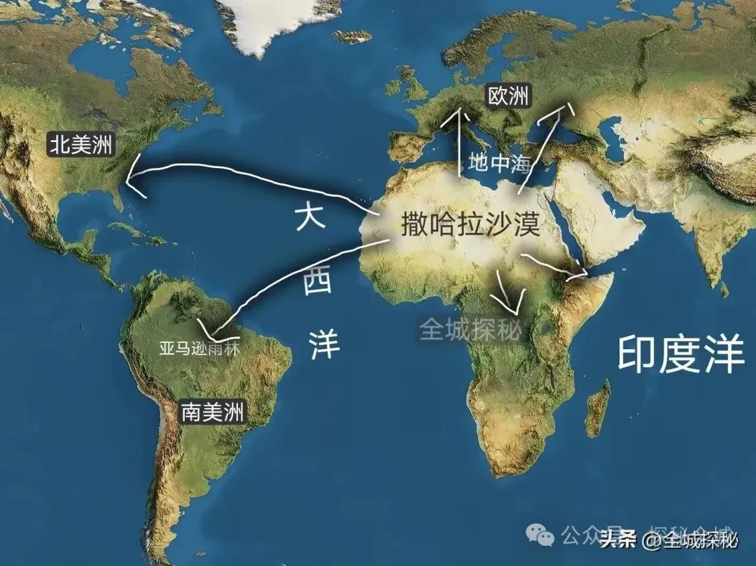 在这里全城探秘也想特意强调一下,如果没有高大山脉的阻拦,“沙借风势”的后果是非常可怕的,就比如世界第一大沙漠撒哈拉沙漠,由于非洲北部地势相对平坦,缺乏高大山地阻隔,沙尘甚至能远跨重洋,向东到达印度洋的一些岛屿,向西则横跨大西洋,直达南美洲的亚马逊雨林;
