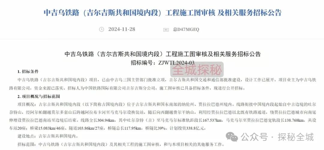 2024年11月28日,《中吉乌铁路(吉尔吉斯共和国境内段)工程施工图审核及相关服务招标公告》发布;