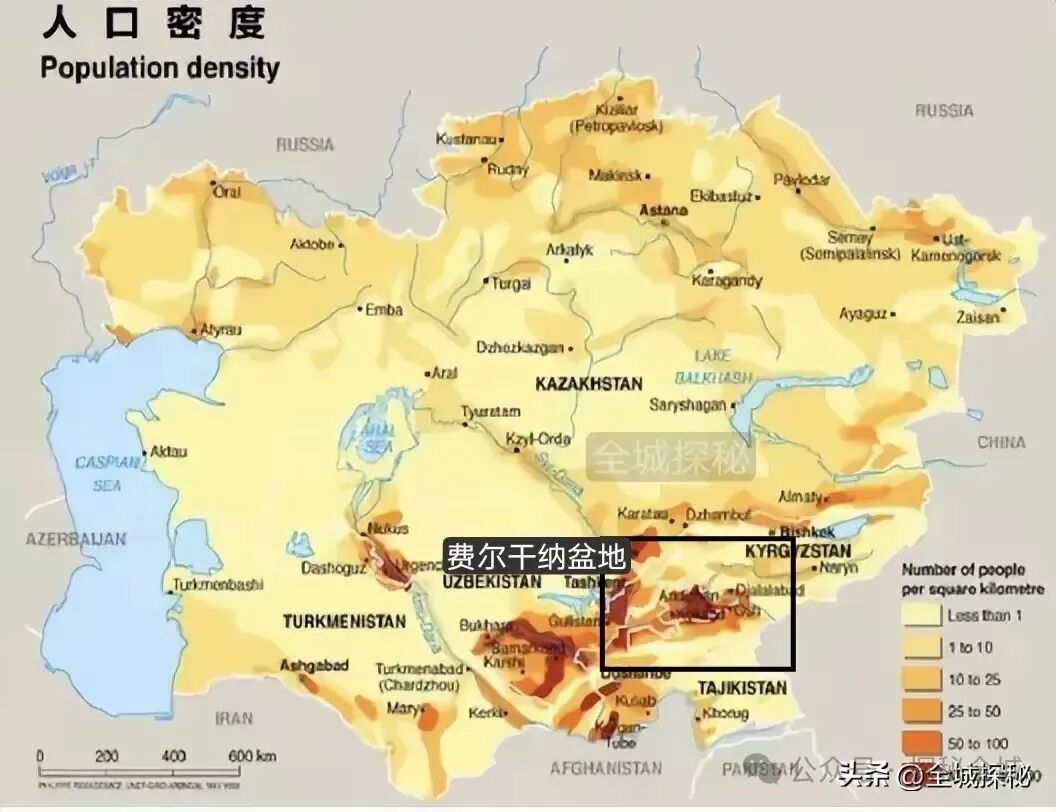 你可能想不到,费尔干纳盆地东西长约300公里,宽70公里,面积仅2.2万平方公里,仅占中亚400万平方公里总面积的0.5%,但盆地内居住的人口却超过1600万,占到中亚总人口的将近20%。