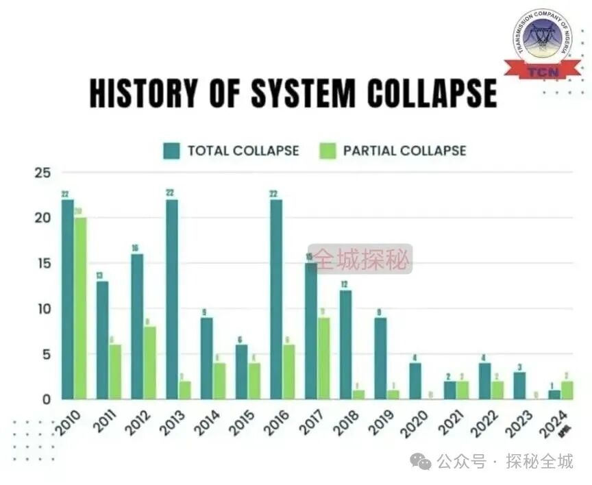 过去十年间,尼日利亚国家电网已发生超过200次大范围故障,并且故障率还在不断上升,2017年-2023年,尼日利亚电网崩溃46次,2022年约10次,2024年截止11月已经发生11次;
