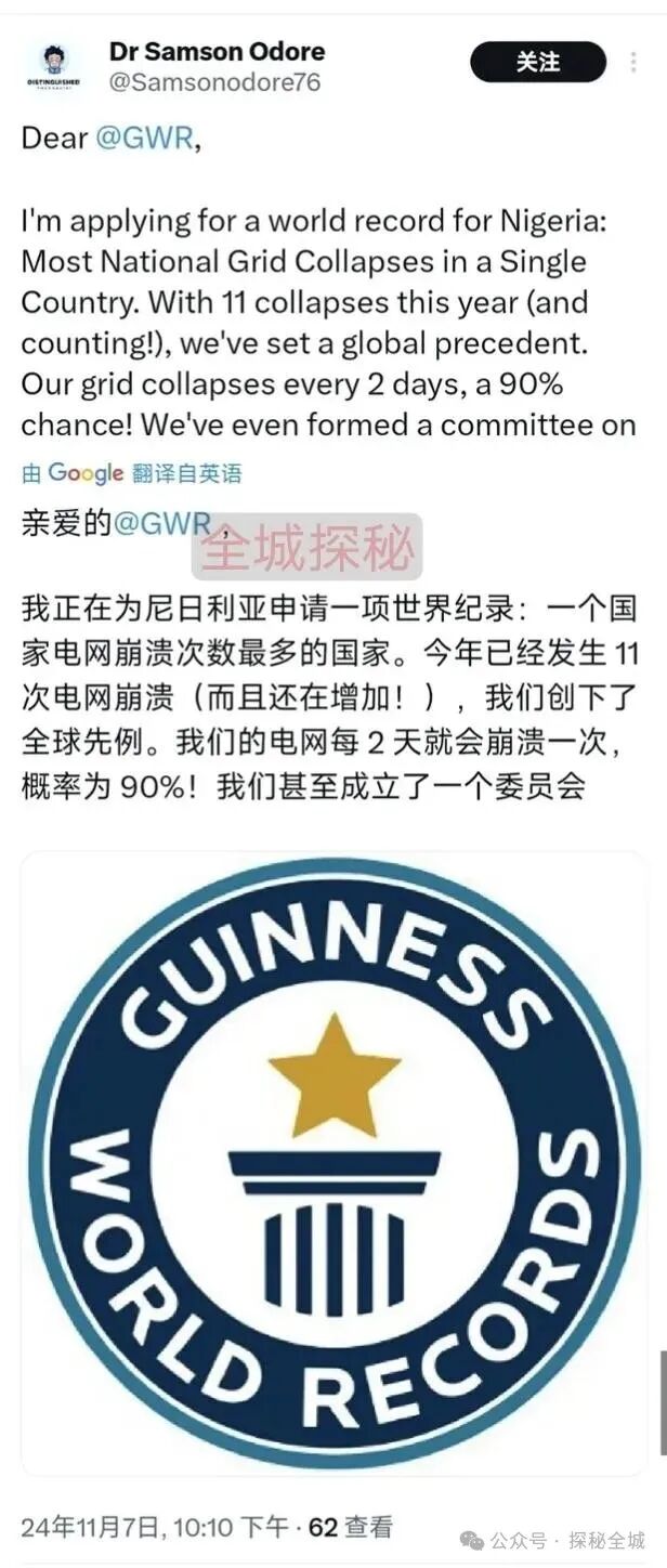 为了处置频繁发生的全国大面积停电事故,尼日利亚专门成立了一个机构,当地人甚至表示,应该为尼日利亚申请一个“电网崩溃次数最多的国家”的吉尼斯世界纪录。