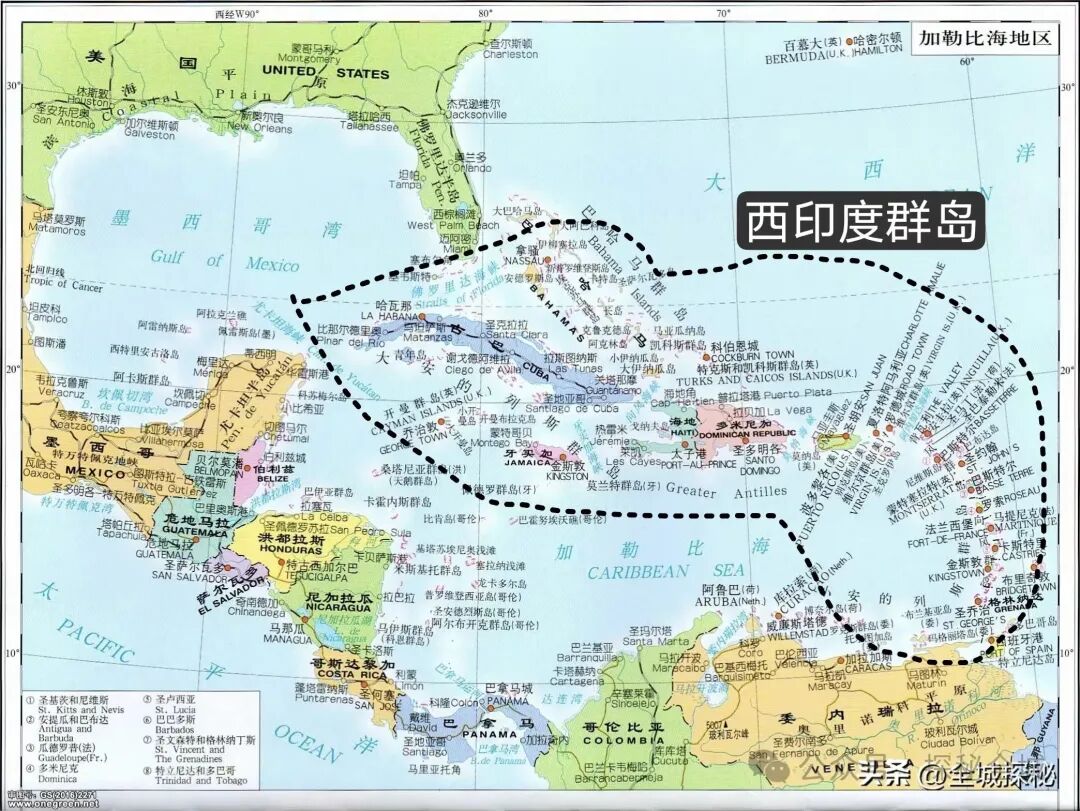 西印度群岛地处南北美洲之间,隔开了北边的墨西哥湾以及南边的加勒比海,从西北端的古巴岛算起,到东南方向毗邻委内瑞拉的阿鲁巴岛,在海洋上延伸了长达4700多公里;