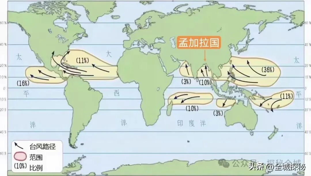 最后,孟加拉国还是印度洋飓风最喜欢的登陆地点,占到了全球台风的10%,这对当地洪水灾害以及土地被海水淹没的影响,同样不可低估。