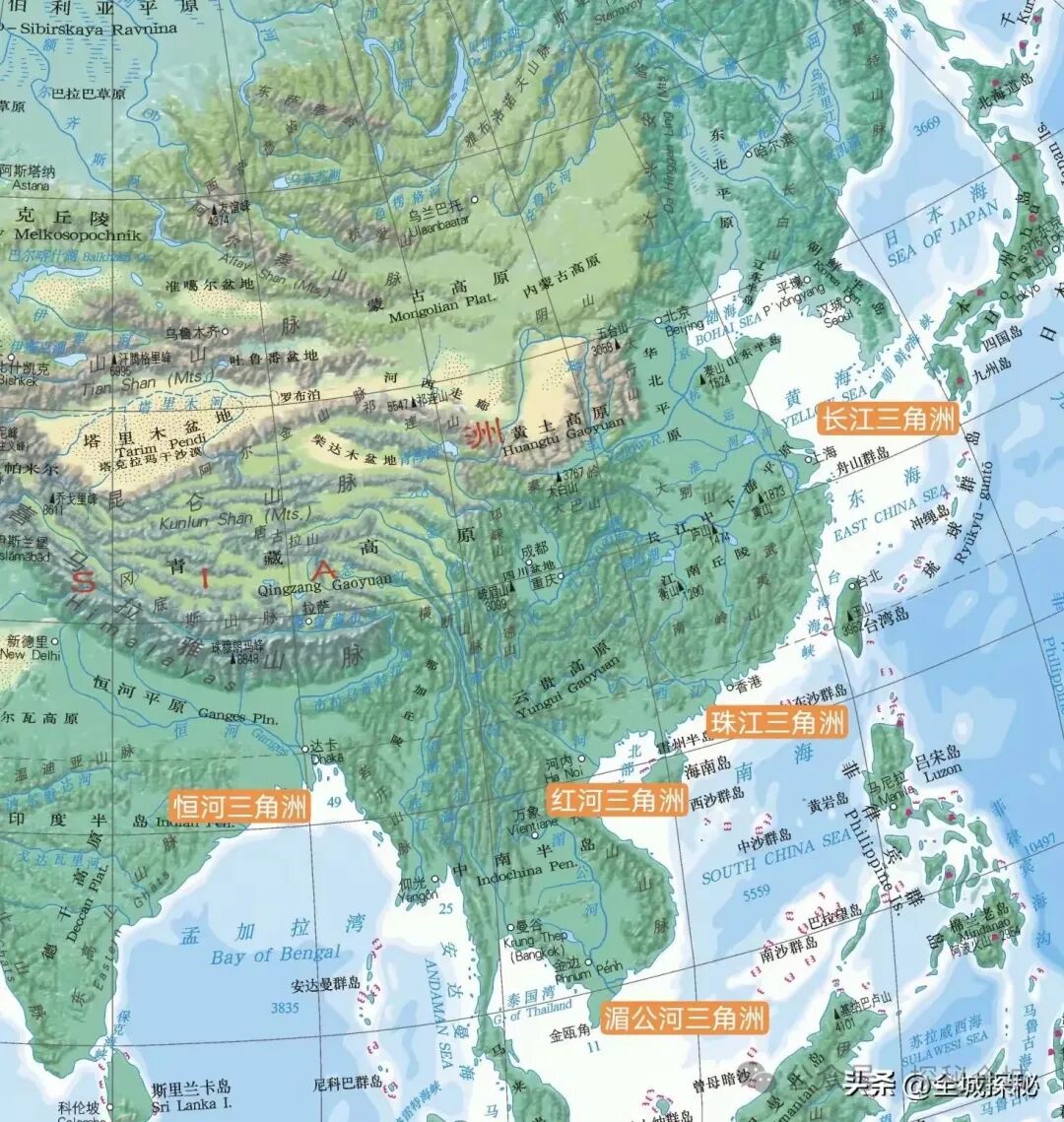 相比之下,我国的长江三角洲、埃及的尼罗河三角洲,平均海拔都不到10米,跟恒河三角洲差不多,但前两者由于国土面积更大,河口三角洲占比较低,所以低平的河口三角洲对全国的平均海拔影响并不大,埃及全国平均海拔就达到700米;