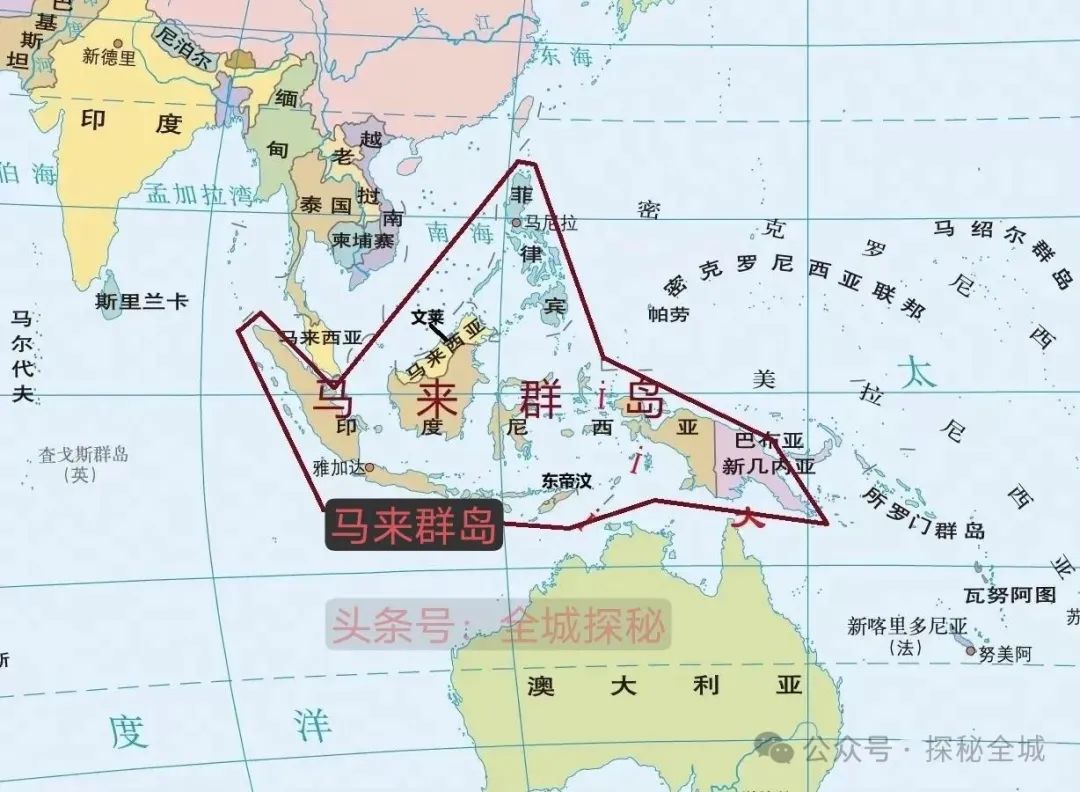 马来群岛位于亚洲东南部,东北毗邻太平洋,西南挨着印度洋,两大洋的分界线从马六甲海峡开始,沿着苏门答腊岛、爪哇岛向东,经过阿拉弗拉海向南折向澳大利亚;