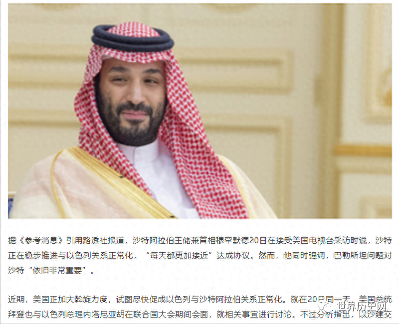 就在上个月,沙特王储兼首相默罕默德在接受采访时称,沙以关系正常化谈判取得进展,沙特正在稳步推进与以色列关系正常化。