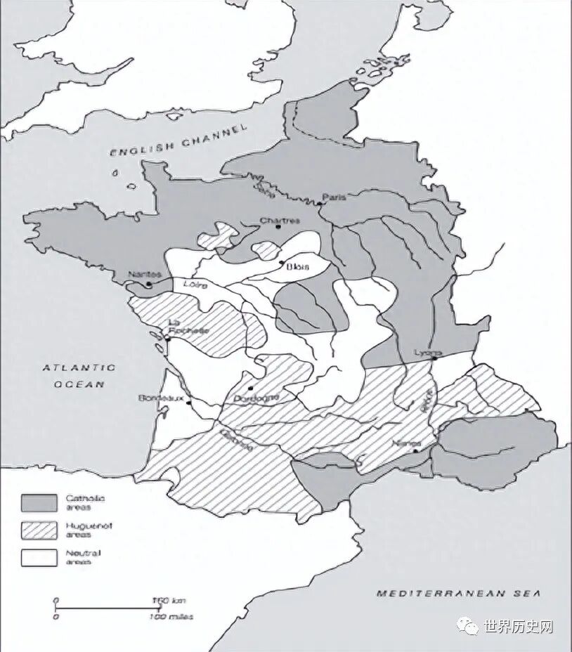 (内战期间双方的大致控制地区,灰色为天主教地区,斜纹为胡格诺派地区)