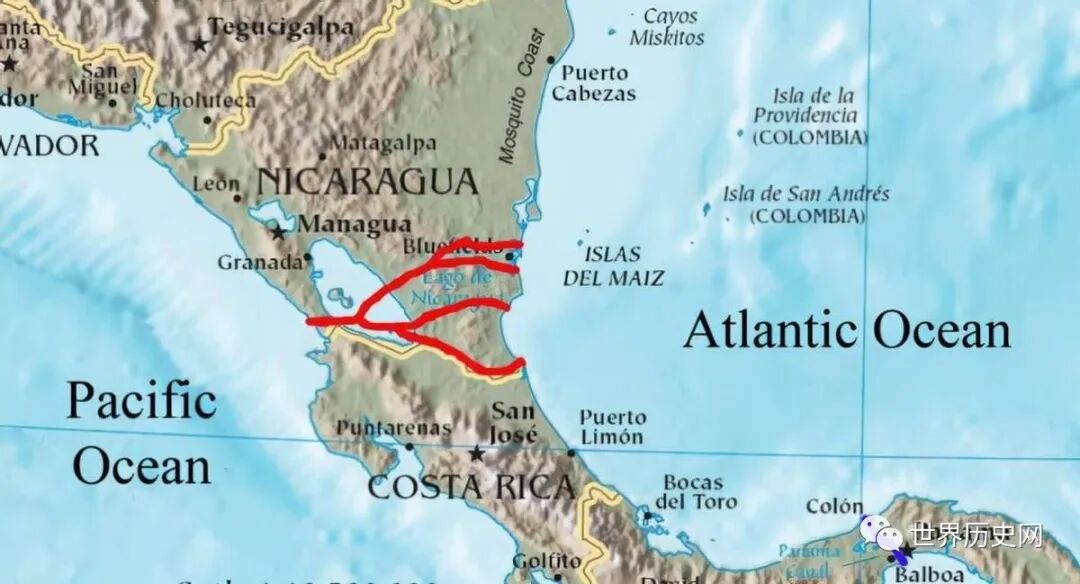 尼加拉瓜的圣胡安河和尼加拉瓜湖是得天独厚的自然水道。只要在此基础上开凿一段运河,就可以把太平洋和大西洋连接在一起。