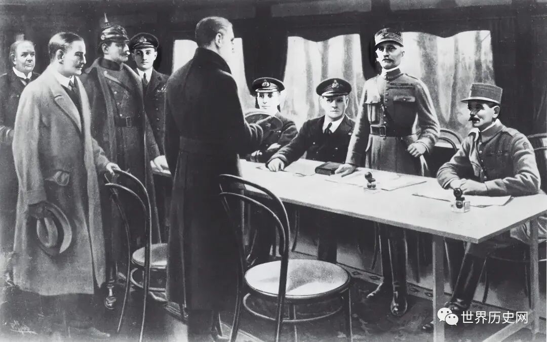 11月11日,德国派出埃尔茨贝格尔率领的代表团,与协约国联军总司令福煦,在法国巴黎北部的一节火车车厢中签署了康边停战协定,该协定标志着德国宣布无条件投降,第一次世界大战以同盟国的失败协约国的胜利而结束。