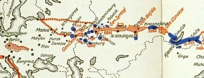 当时他们已经能够通过西伯利亚铁路通行,使其东进速度大大加快。之后,他们沿西伯利亚铁路一路向东攻击,到月底就抵达海参崴并将其攻占。按说这时他们已经可以从海路前往法国了,但这时捷斯军团的野心才真正暴露了出来:他们不但没有乘船前往法国,反而重新调头向西,帮助其它反苏俄的白军打击苏俄红军。