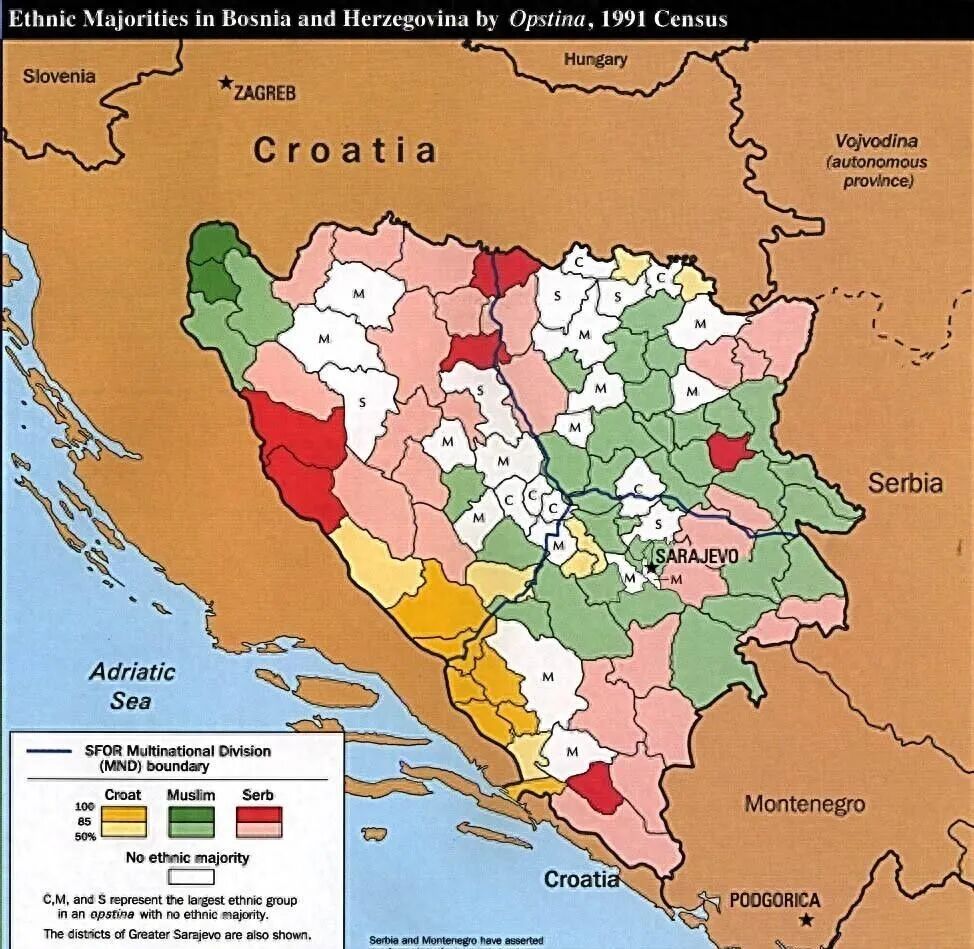 这样其实到20世纪初,波黑境内三族鼎立的局面就已经基本形成。虽然在20世纪的南斯拉夫王国时期和二战后的南斯拉夫时期,南斯拉夫政府都曾推出南斯拉夫族这个概念,希望消弭包括波黑在内的南斯拉夫各地的民族差异,但最终这些努力都没能成功,波黑还是形成了现代三族鼎立的局面,而这也为20世纪波黑出现的民族战争埋下了伏笔。