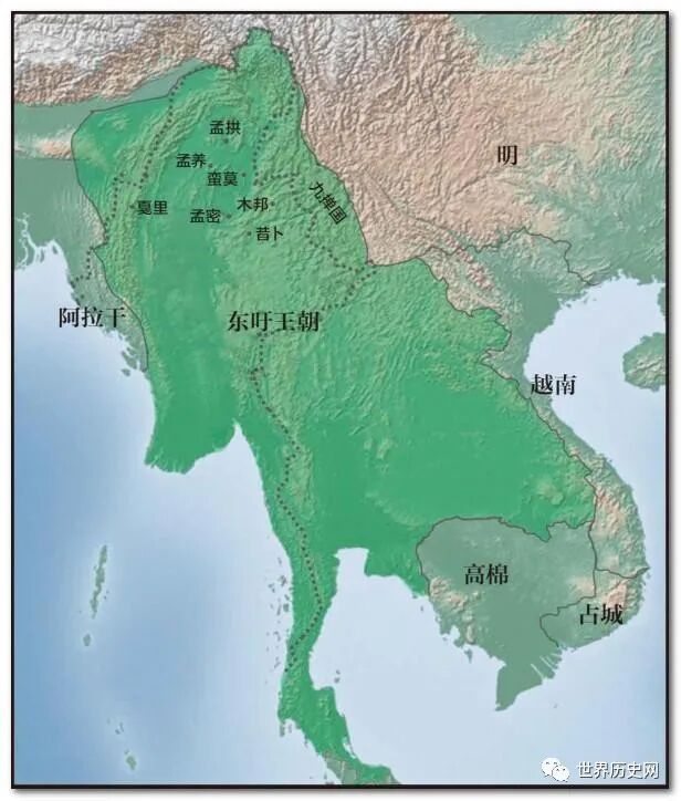 与明朝同期的缅甸东吁王朝一度征服了泰国,成为了中南半岛区域强国,甚至出兵进犯云南,最后被明朝将领刘綎和邓子龙击败,然而明朝也仅是守住了云南本土,原来归附于明朝的宣慰司都被缅甸尽收囊中。