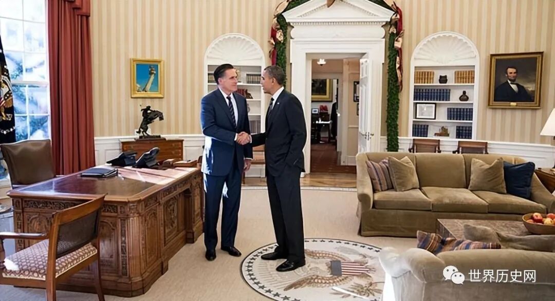 这是2012年的奥巴马在白宫私下会见他的政敌罗姆尼。