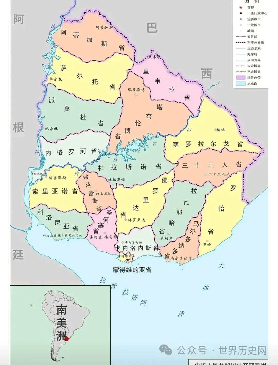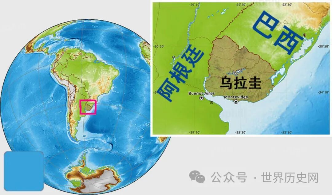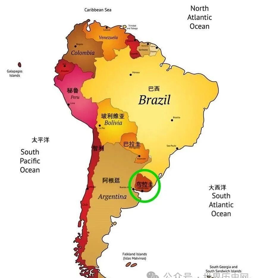 乌拉圭是一个位于南美洲东南部的小国,它的北面和东面与巴西接壤,东南面是大西洋,西面是阿根廷。土地总面积约为17.6万平方公里,跟我国贵州省的面积几乎相同,是南美洲第二小的国家。