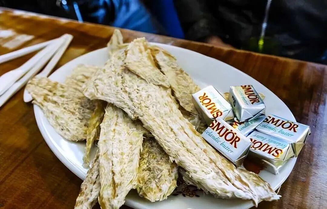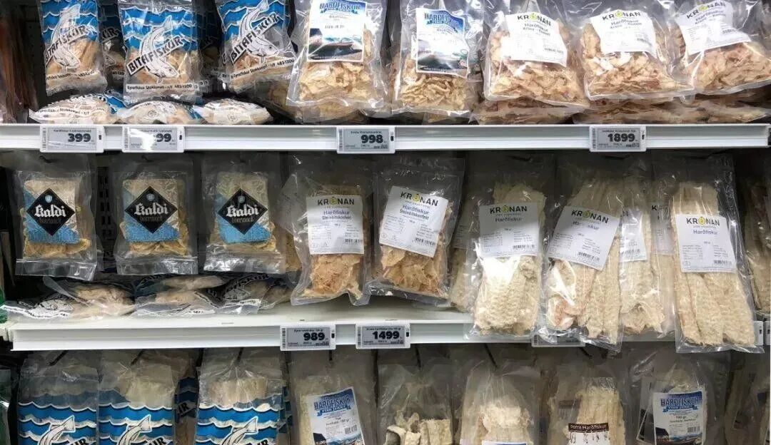 冰岛是一座小岛,海产资源丰富,大家会把捕猎得到的鱼类,给制作成“小鱼干”。当地人称为“Harðfiskur”,这种小鱼干被他们当成日常零嘴,在超市、便利店随处可见。他们还会将其加入咖啡、茶之中泡软使用,当然也是冰岛餐食里必不可少的一部分。