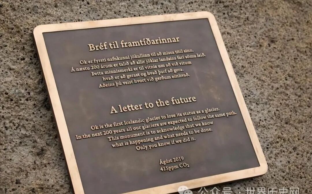 随着全球气候变暖,地球南北极大量的冰川消融,其中位于北极圈附近的冰岛境内,就有数座冰川消融,在2019年,冰岛人为其中一座名叫“Okjokull”的冰川举行追悼会,冰岛总理、政府官员、民众皆有出席。并在遗址上放置了纪念碑,上面写有一封“为未来的信”,由冰岛作家“Andri Snaer Magnason”撰写。(内容翻译在本文末尾处)