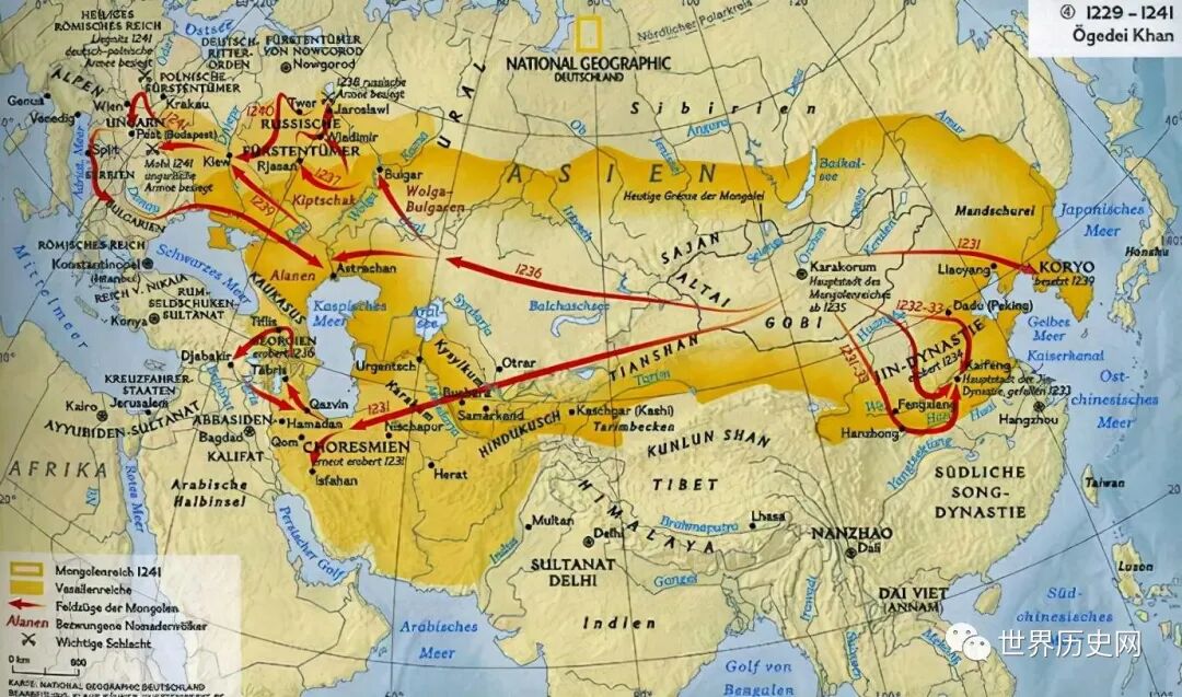 蒙古势力很快便到达了乌克兰和白俄罗斯地区。然后继续西征,击败强大的波兰和罗斯,兵锋直指莱茵河流域,东南则拿下了匈牙利,在扫荡了中欧和东欧之后,蒙古拿掠夺了无数财宝,随后满载东归。