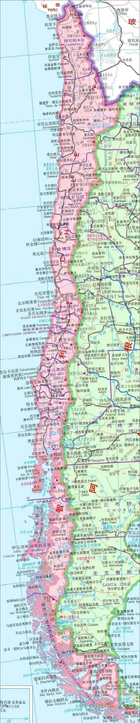 智利的版图从北到南的跨越4352公里,如果只算陆地上的南北跨度,智利无疑是世界上跨度最大的国家。但智利在东西方向上却极其狭窄,平均宽度只有109公里。而且其国土东侧还有大约1/3到一半是安第斯山区,所以其绝大多数人口都居住在西侧那几十公里更加狭长的地带里,这在世界上也绝对是独一无二的情况了。那么智利这种独特的版图究竟是怎么形成的呢?