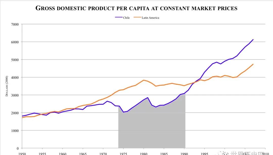 1950到2010年智利人均GDP(蓝色)与拉美平均水平(粉色)比较,阴影区为皮诺切特执政时期