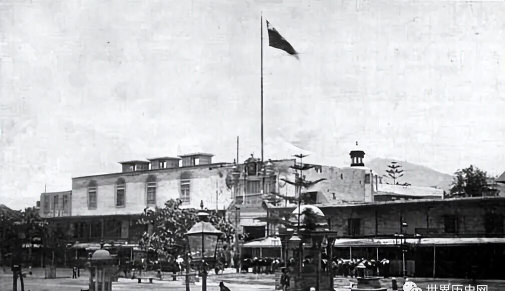 硝石战争中智利军队在秘鲁政府所在地升起智利国旗的景象