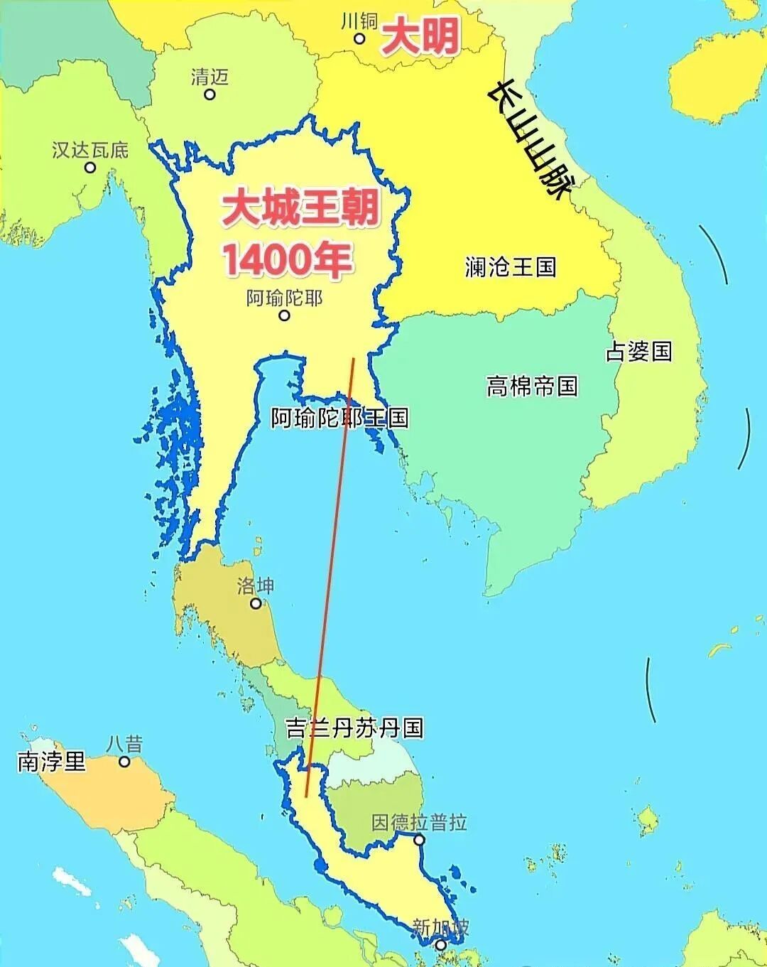 与此同时,暹罗开始大举进攻高棉吴哥帝国,并于1431年攻破其首都吴哥,迫使高棉人不得不向东撤退。大城王朝版图极盛时期,势力一度北抵大明帝国,南达马来半岛,东至长山山脉,连南掌都臣服于它。