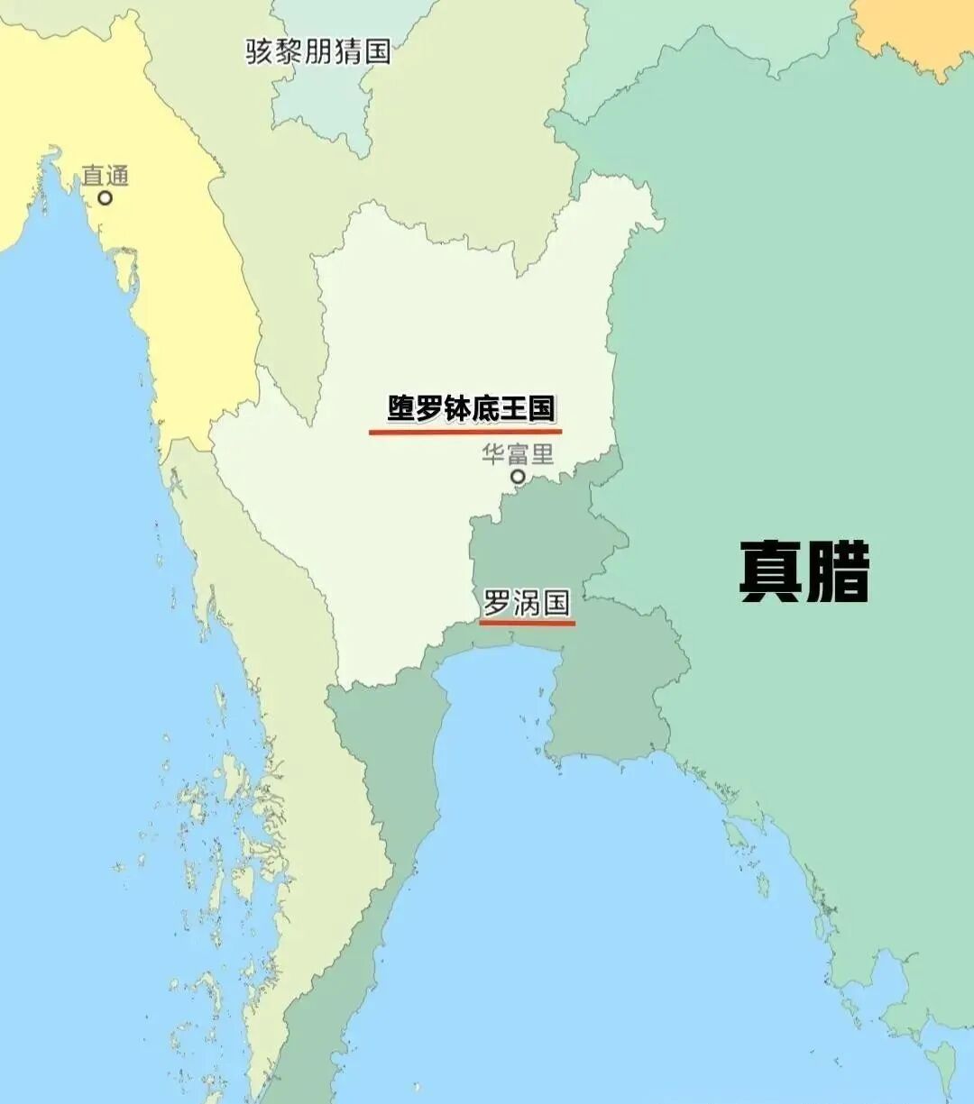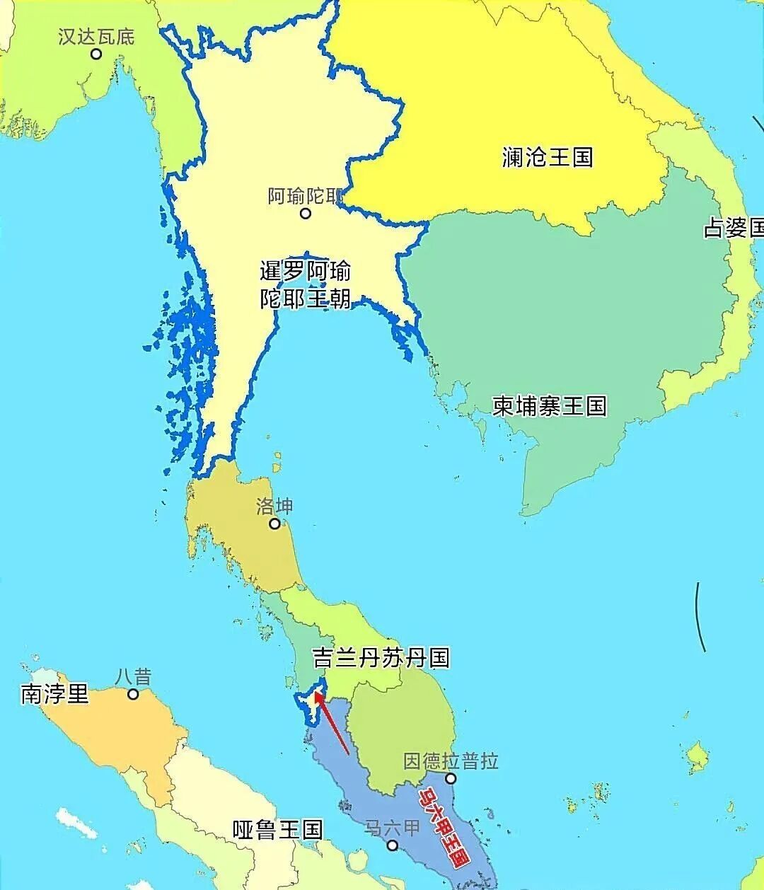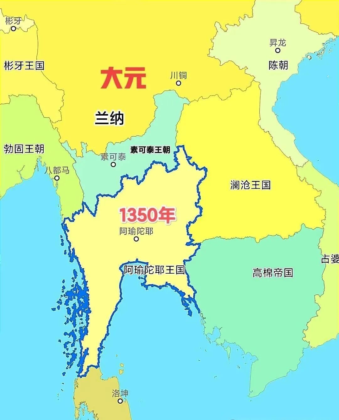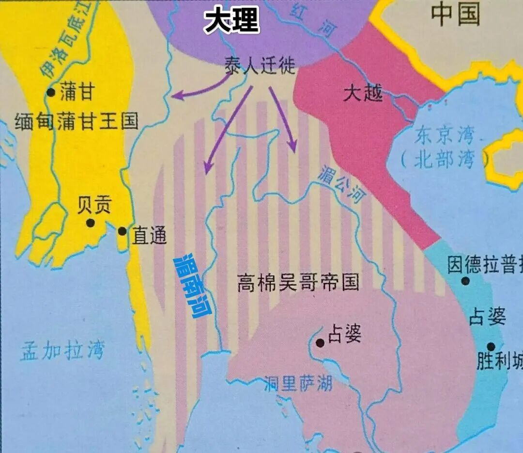 不过在泰人到来之前,湄公河流域其实是有国家的。北面是堕罗钵底王国,南面是罗涡国或者叫罗斛国,可能都是孟人建立的。两个国家后来都被半岛霸主高棉帝国所征服,不过后来罗涡国很快又复国了。