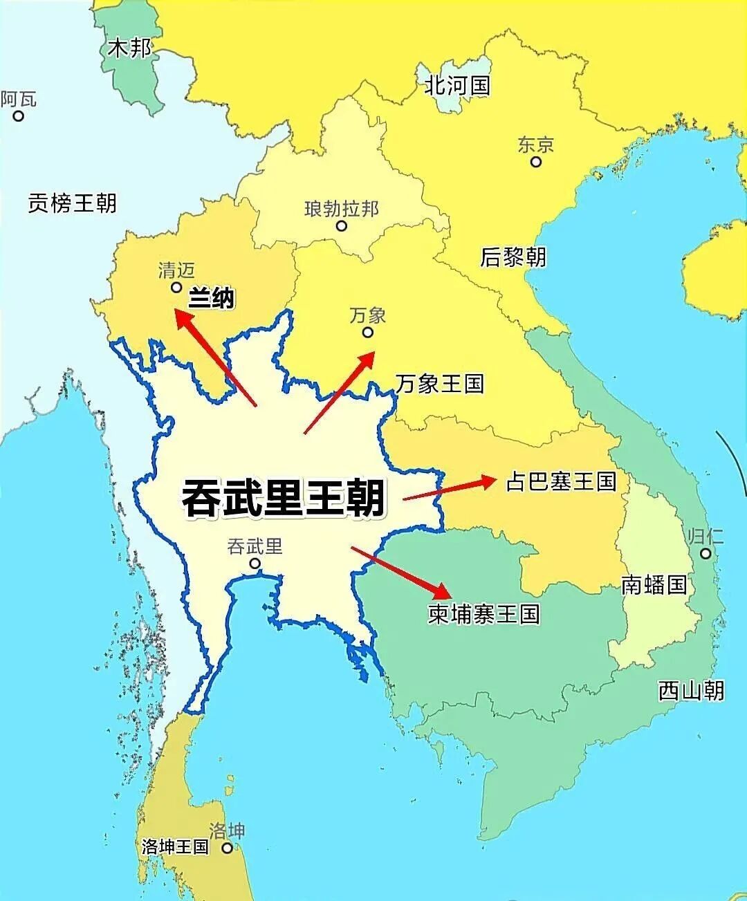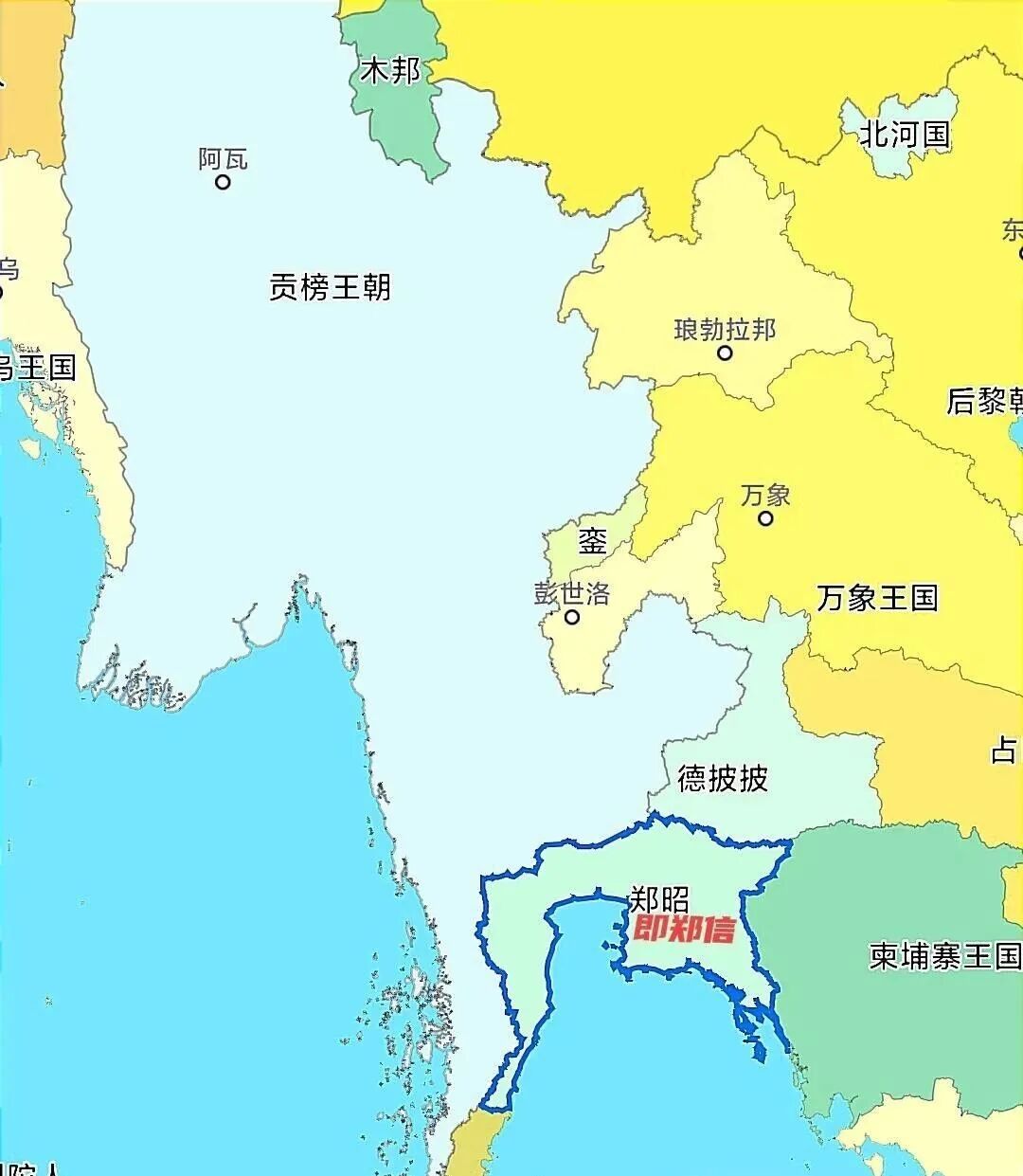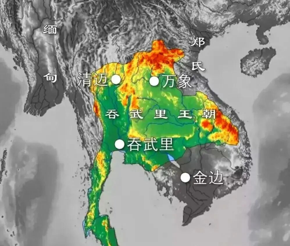 但是暹罗南部的抵抗力量仍继续战斗,1767年中暹混血皮耶达信将军率军抗缅,并于1768年在吞武里加冕为王,开启了泰国第三个王朝——吞武里王朝。缅甸再次得意忘形,根本没把暹罗残余力量放在眼里,忙着去跟清朝干仗。皮耶达信与高棉合作,趁机攻克清迈,多次打败缅甸,消灭了各地割据势力,再次使暹罗走向统一。