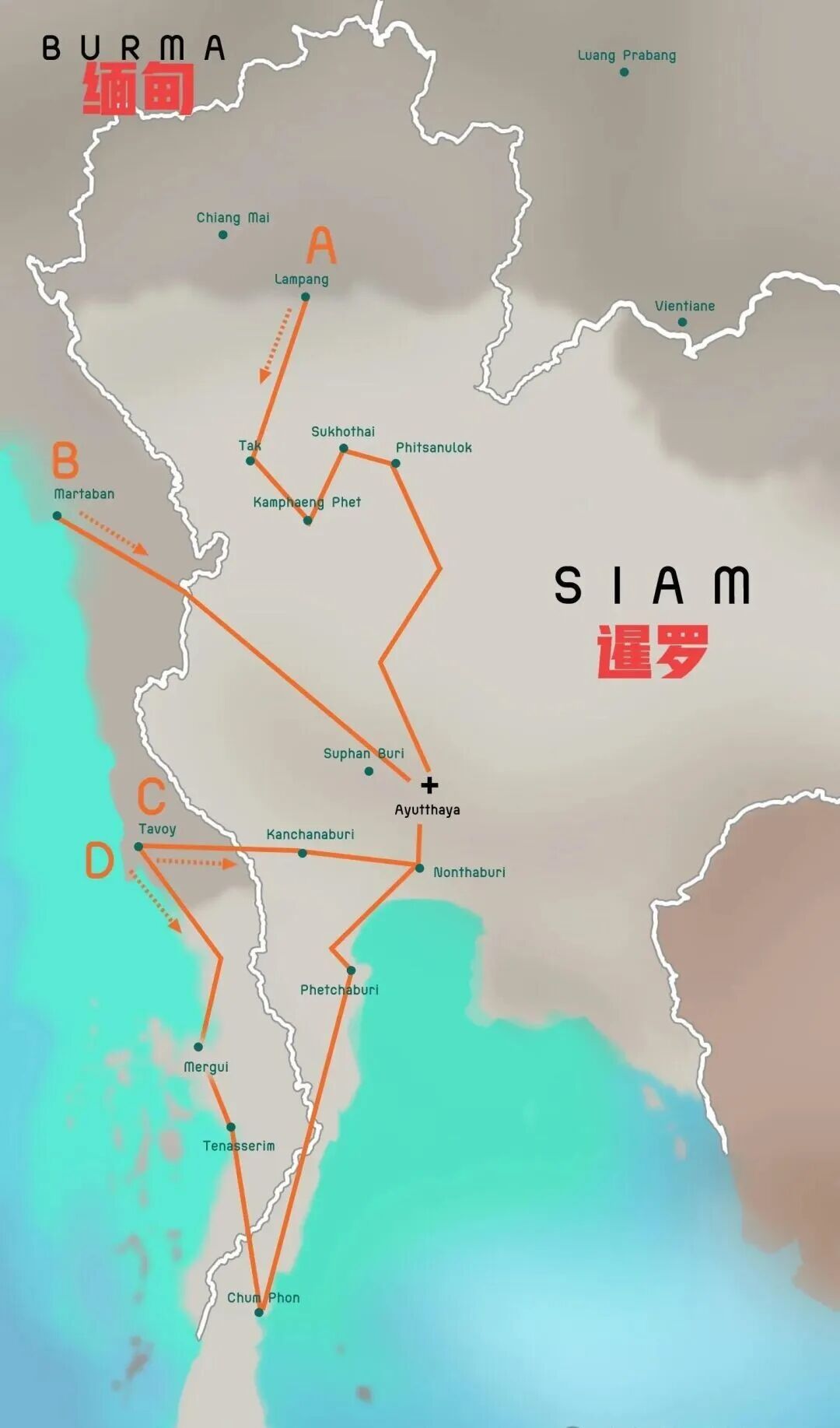 此后,缅甸陷入分裂内乱,走向衰落,暹罗进入了很长一段时间的稳定期,直到18世纪中叶,都没有遇到大规模进攻。