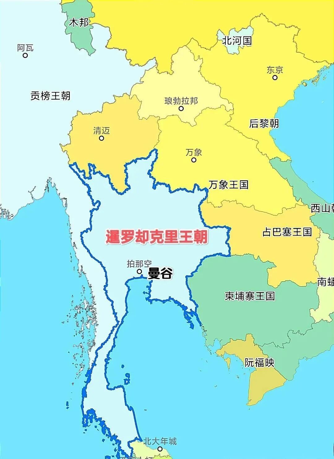却克里王朝开启后,继续对外扩张。1782年,灭掉洛坤王国。1786年暹罗灭掉了南部的北大年苏丹国,将其纳入版图,势力进一步渗入马来半岛。1795年,暹罗又割取了柬埔寨的马德望和暹粒两省。