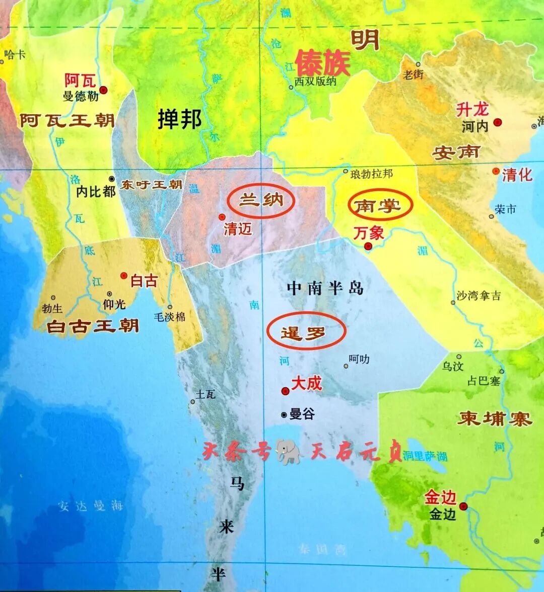 哀牢人一部分沿澜沧江往东,定居在湄公河上游,他们后来建立了一个小国澜沧,或者叫南掌,即今日老挝的佬族;一部分西迁在伊洛瓦底江上游建立掸国,即今日缅甸的掸族;一部分南下湄南河,分别建立了暹罗和兰纳,这些人就是泰人;留在原地的那部分哀牢人就是后来的傣族人。所以,傣泰民族原本是一家。