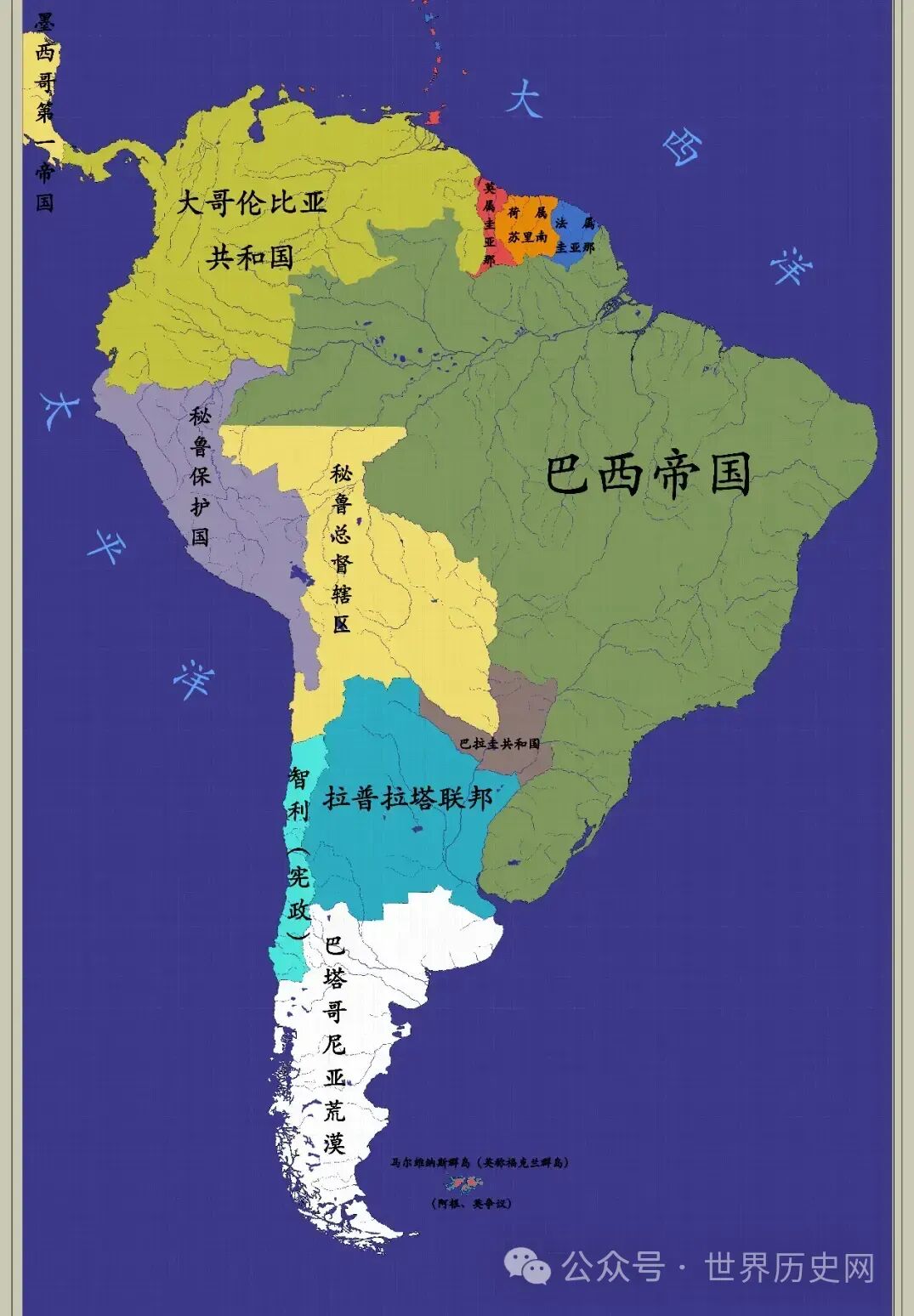 西蒙·玻利瓦尔经过多年的奋斗,终于在1819年将委内瑞拉和哥伦比亚从殖民者手中解放出来,并成立大哥伦比亚共和国。并与南美洲南部的圣马丁的军队共同夹击西班牙,1825年,西班牙宣布投降,彻底退出了南美大陆。