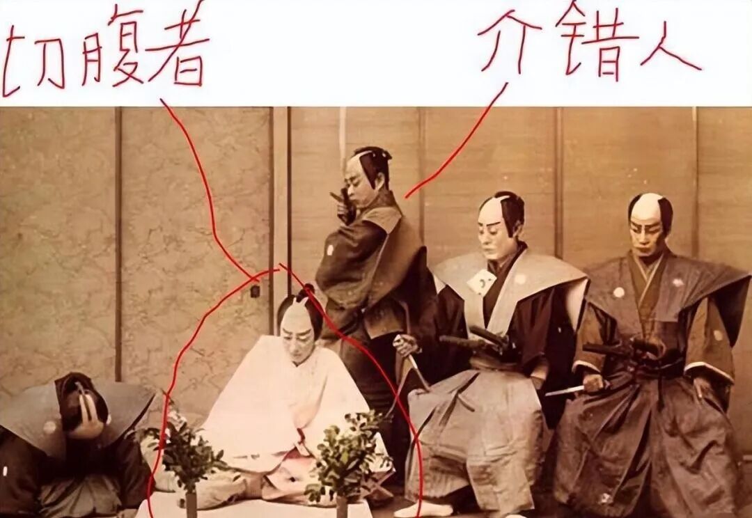 切腹者在即将执行时,旁边会有两名介错人,一人在切腹者背后做好拔刀准备。
