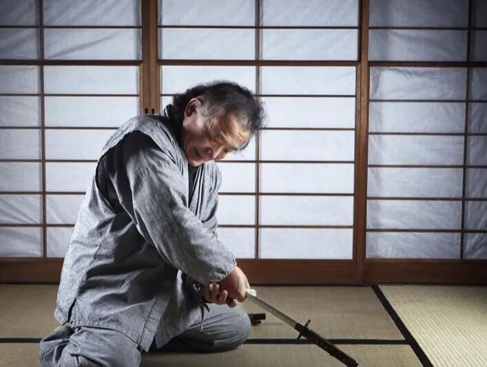 待仪式流程走完以后,剖腹人要手持武士刀从腹部横着切一刀。