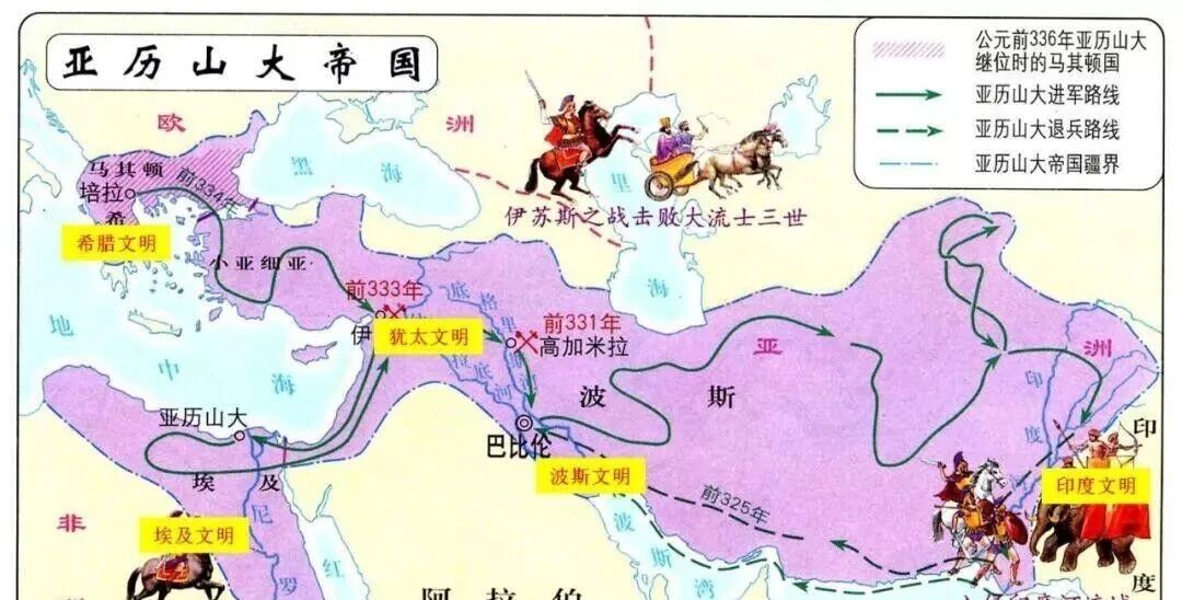 从公元前334至公元前331年间,亚历山大大帝领导3.5万兵力作战,成功地战胜了波斯国王大流士三世的大军。
