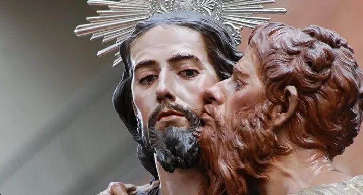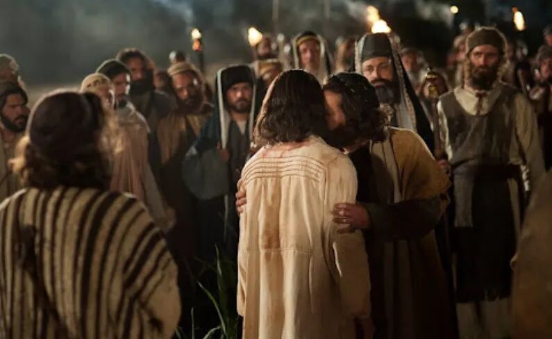 新约圣经中说,犹大在耶稣被捕的前夜,与犹太教的祭司长们达成两协议,以三十枚银币作为出卖耶稣的报酬,并在最后的晚餐上,犹大通过一个吻指认了耶稣。