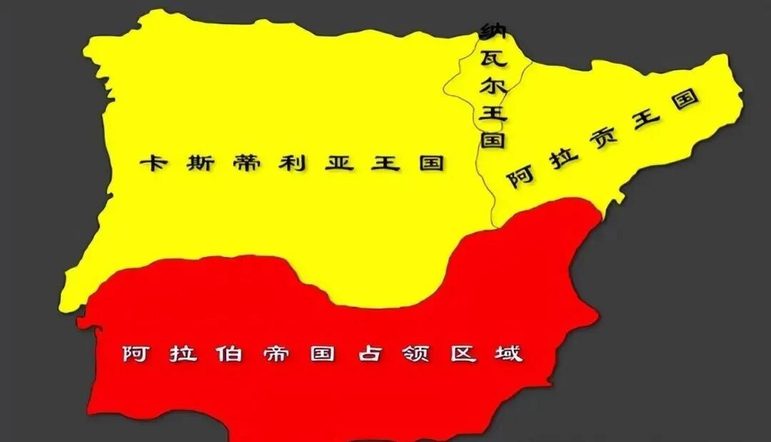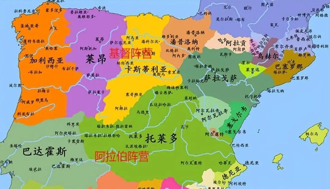 如同十字军东征一般,基督徒在和摩尔人对抗期间也相继在半岛建立了国家,刚开始只有西哥特贵族的阿斯图里亚斯王国(后改名为莱昂王国),后来又有了巴斯克人(系本土伊比利亚人)的潘普洛纳王国(即后来的纳瓦拉王国),再后来这两个王国又分别析出了卡斯蒂利亚和阿拉贡两国,另外还有两处自治权较大的贵族领地,分别是加利西亚和巴塞罗那。