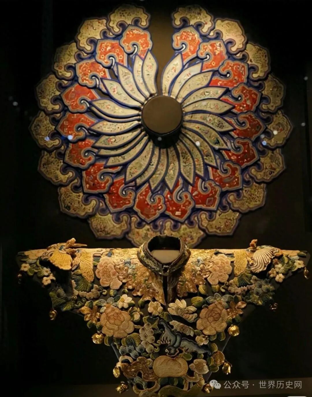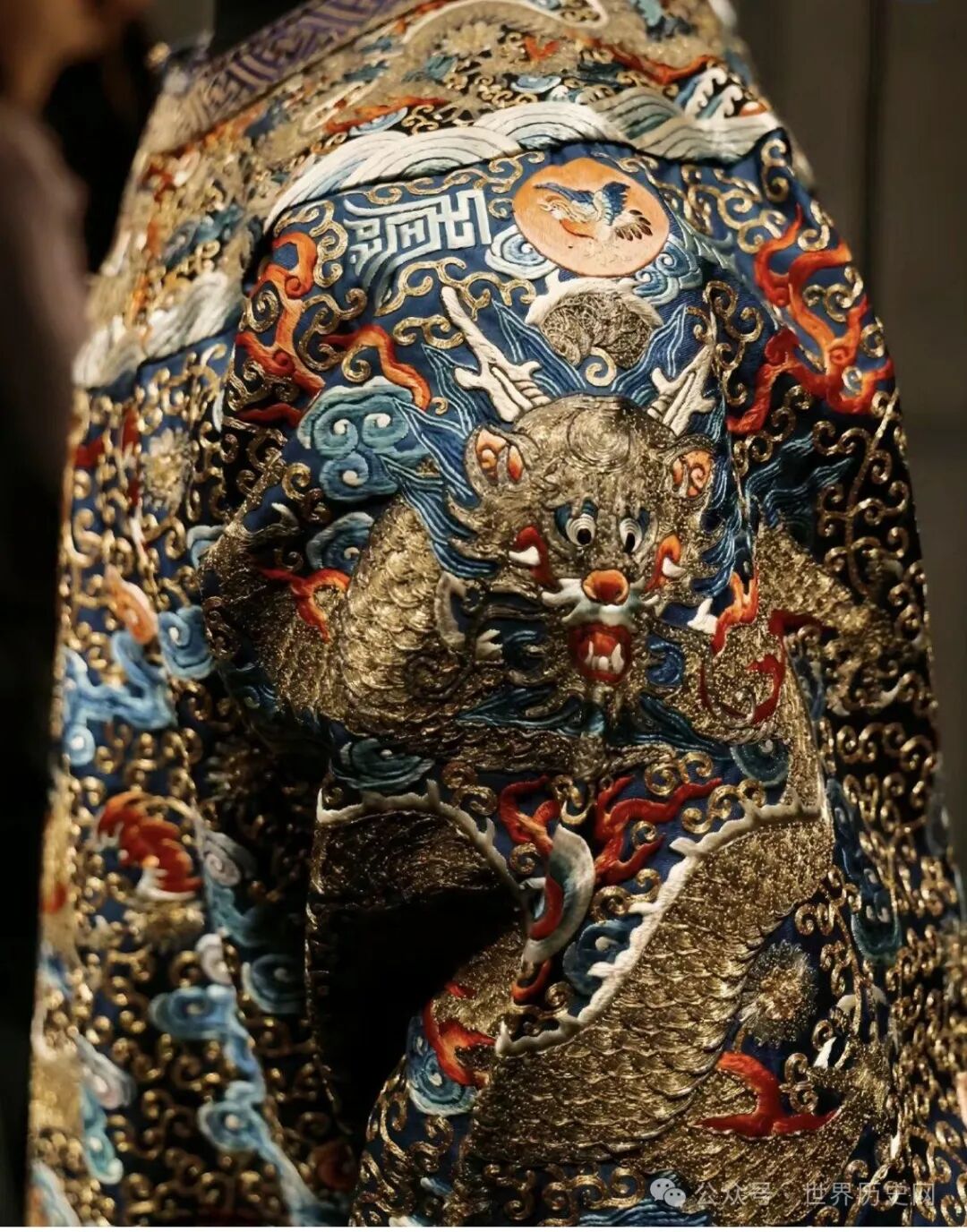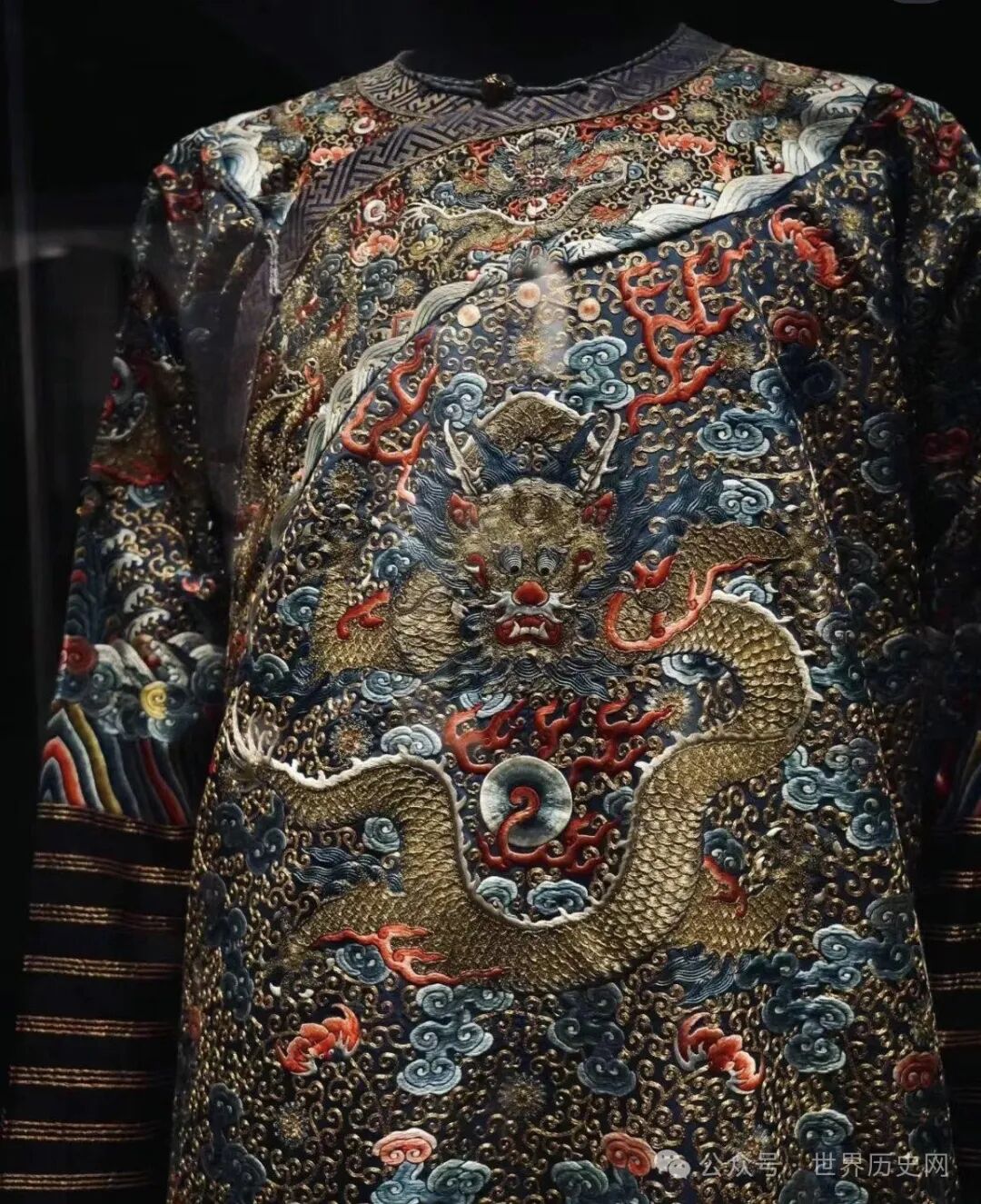 被八国联军抢走的中国皇帝的龙袍,目前就在大英博物馆中, 这件皇帝袍服,制作于1800年代苏杭的皇家工坊。用五彩丝线和金线刺绣而成。这刻丝工艺精细到密孔的惊艳,背后是26位画工285位精工608位绣工,需要一到两年才能制成一件。