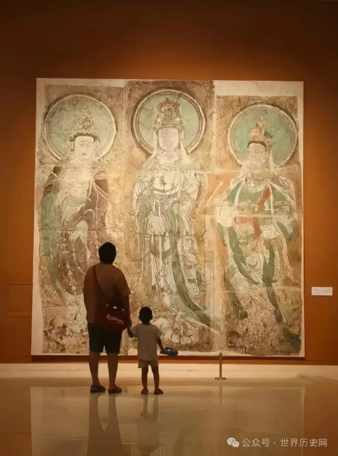 你见过这幅大英博物馆最深处的中国壁画吗?这幅壁画是来自河北清凉寺的一组三菩萨迎宾像。最左边的是普贤菩萨,中间的是观世音菩萨,最右边的是文殊菩萨。上个世纪,英国商人看中了这个壁画,但是清凉寺属于附近五个村子的共同财富,于是他们派出英军上尉柯林斯前去谈判,最后花了十万大洋买了下来。