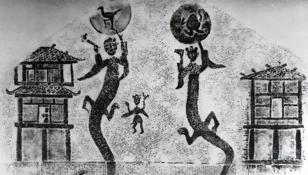1963年,新疆的吐鲁番考古队在新疆的阿斯塔纳古墓中,出土了名为《伏羲女娲交尾图》的画卷,出土时图画位于墓顶的位置,画面呈现朝下的状态。