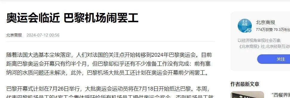 以上信息来源:北京商报2024年7月12日“奥运会临近 巴黎机场闹罢工”