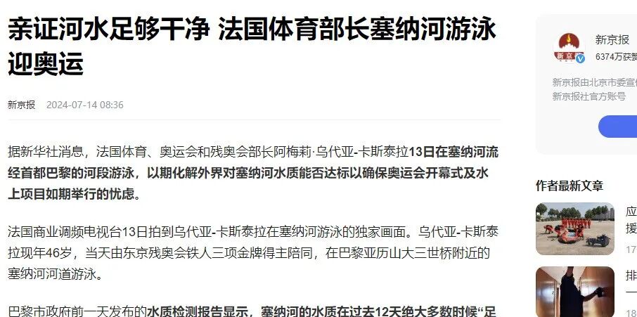 以上信息来源:新京报2024年7月14日“亲证河水足够干净 法国体育部长塞纳河游泳迎奥运”