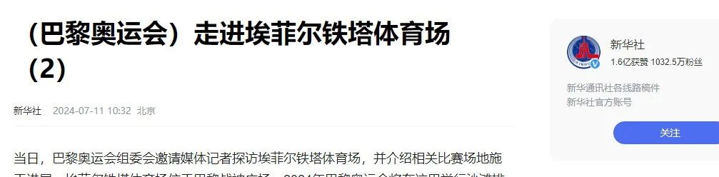 以上信息来源:新华社2024年7月11日“(巴黎奥运会)走进埃菲尔铁塔体育场(2)”