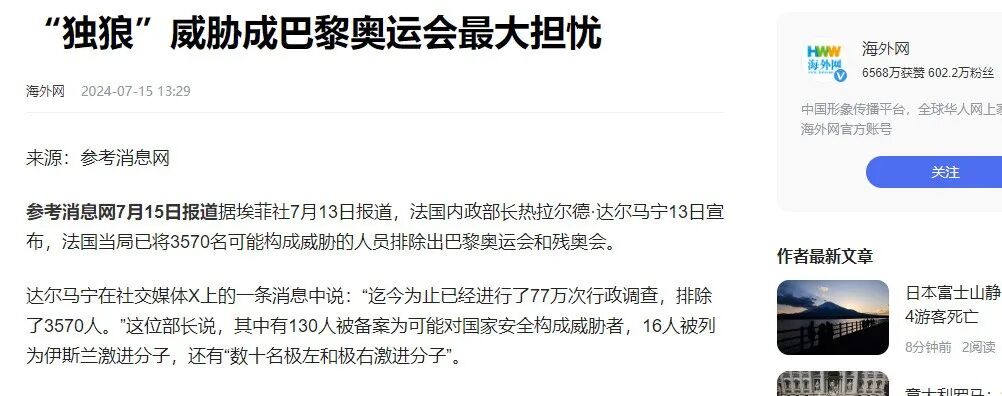 以上信息来源:海外网2024年7月15日““独狼”威胁成巴黎奥运会最大担忧”